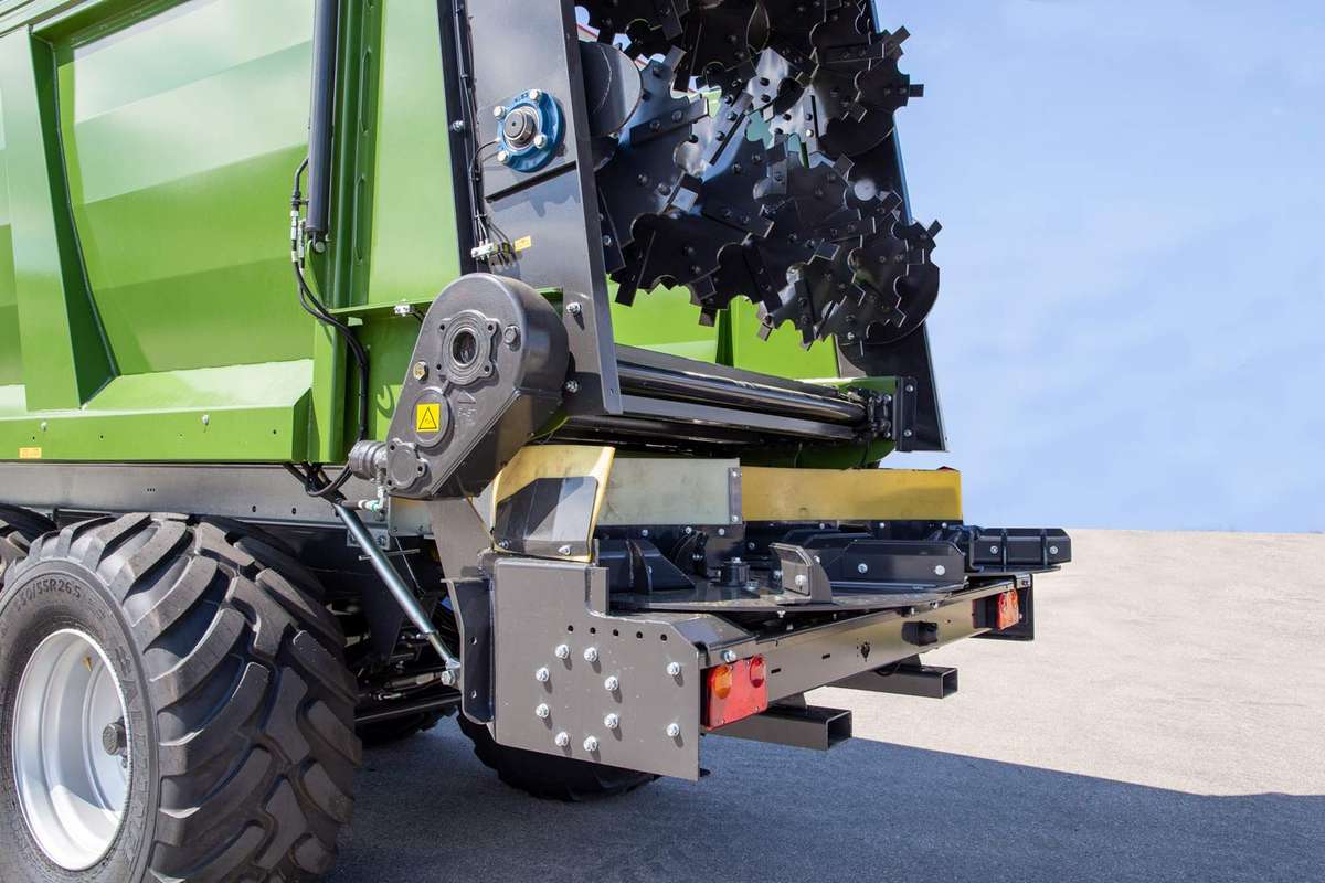In order to be able to fulfill the wishes of all customers, Fliegl now offers with its KDS not only the tried and tested push-off technology but also a scraper floor as the feeding technology. It consists of two chains with 140 chain links each. Each individual chain link has a breaking load of 50 t. The chains connect 41 continuously closed scraper floor strips. The scraper floor is driven hydraulically via a side gear and the speed can be continuously adjusted. If the chains lose their tension over time, a mechanical or optionally hydraulic chain tensioner ensures easy maintenance.