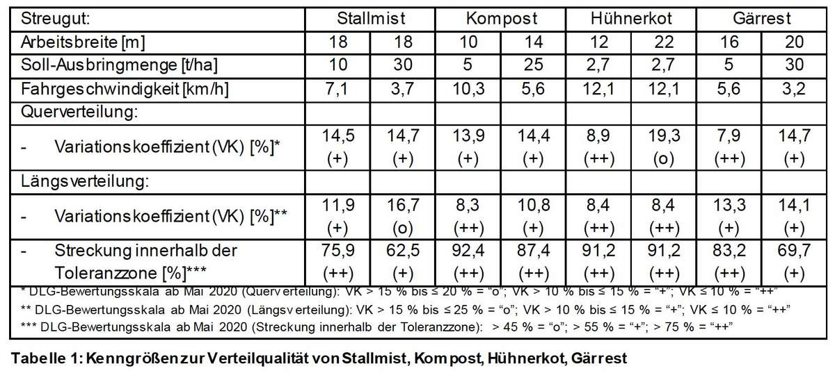 The coefficients of variation determined for evaluating the lateral distribution are below 20% for all four spreading materials and are evaluated as good (+) for manure and compost for both application rates. The lateral distribution of chicken manure is rated very good (++) at a working width of 12 meters and rated passed (o) at 22 meters. In the case of digestate, the lateral distribution is rated very good (++) for an application rate of 5 t / ha and the associated working width of 16 meters and good (+) for 30 t / ha and a working width of 20 meters.